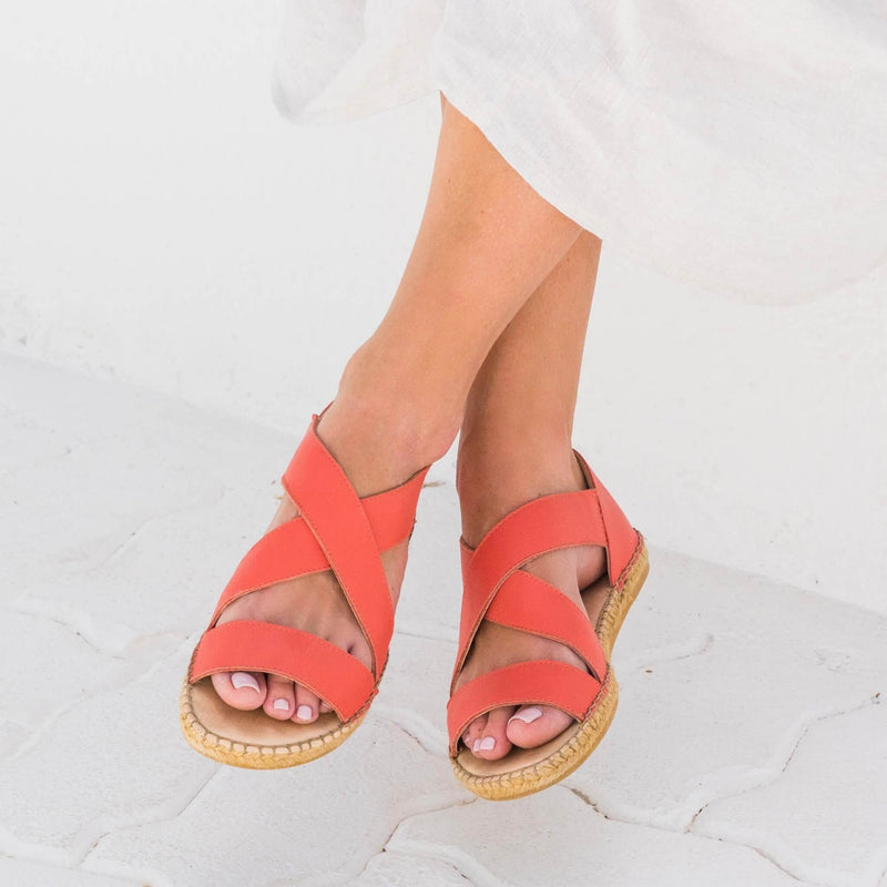 The Beach Espadrille in Coral brings a vibrant pop of summer colour to the collection. Handcrafted in La Rioja, Spain, these coral flat espadrilles feature warm coral-pink leather uppers and our signature cushioned microfibre memory foam innersole for exceptional walking comfort. The elasticated cross-over straps create a secure fit that stays put all day long.